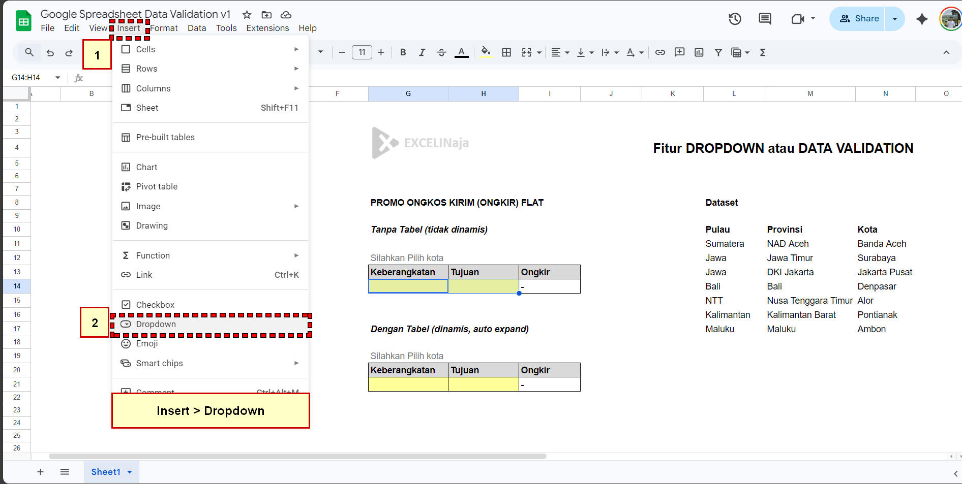 Fitur Dropdown di Google spreadsheet ada di Insert > Dropdown